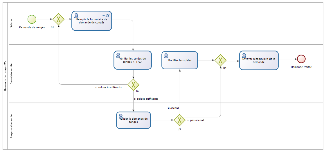 Les exercices de cette page ont pour objectif de vous familiariser avec l'exécution de processus de manière concrète. Pour cela, on s'intéresse à une entreprise qui souhaite informatiser son processus de gestion des demandes de congés dans le cadre d'une démarche SOA.
