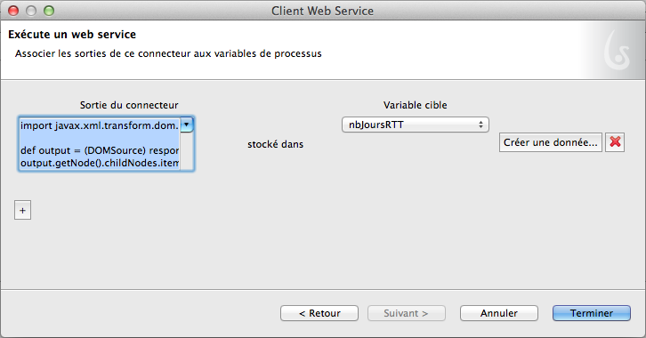 Il faut ensuite configurer la sortie du connecteur de manière à récupérer dans une variable de votre processus la valeur qui est retournée par le service. En effet, le web service renverra une réponse SOAP comme celle-ci :